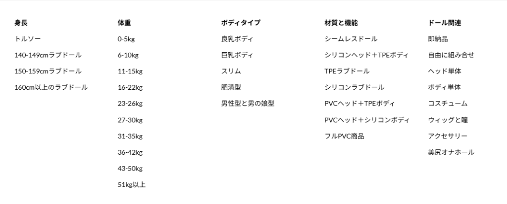 多くの代理店サイトでは、次のような条件でドールを絞り込める。